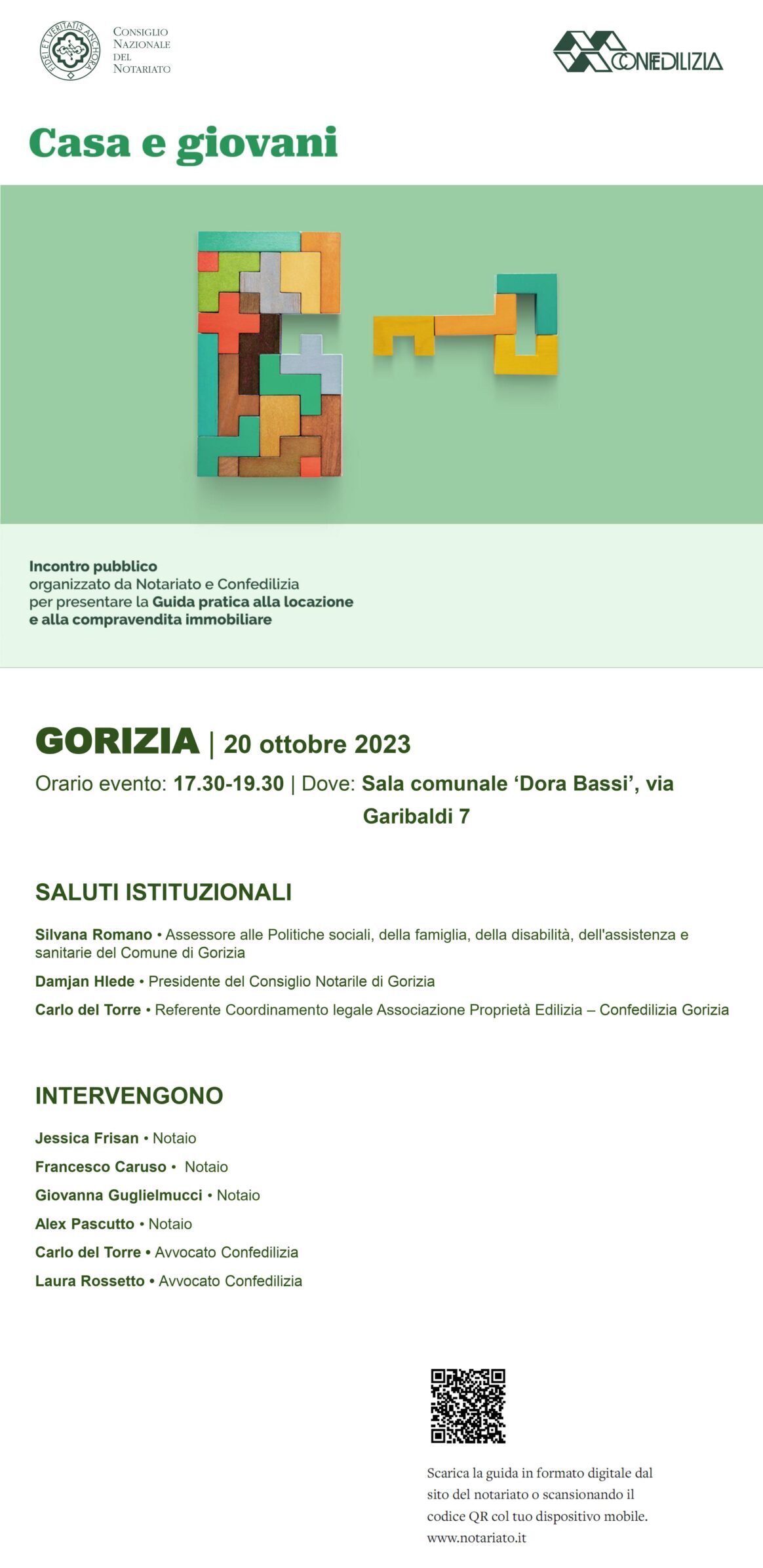 Gorizia, 11 ottobre 2023 – Si terrà venerdì 20 ottobre 2023 a Gorizia, presso la Sala comunale ‘Dora Bassi’, alle ore 17:30, l’incontro pubblico promosso dal Consiglio Notarile di Gorizia per presentare la Guida pratica alla locazione e alla compravendita immobiliare “Casa e Giovani”, realizzata dal Consiglio Nazionale del Notariato e da Confedilizia, l’Associazione dei proprietari di casa, per accompagnare e orientare le giovani generazioni nella scelta della soluzione abitativa più adeguata alle proprie esigenze.