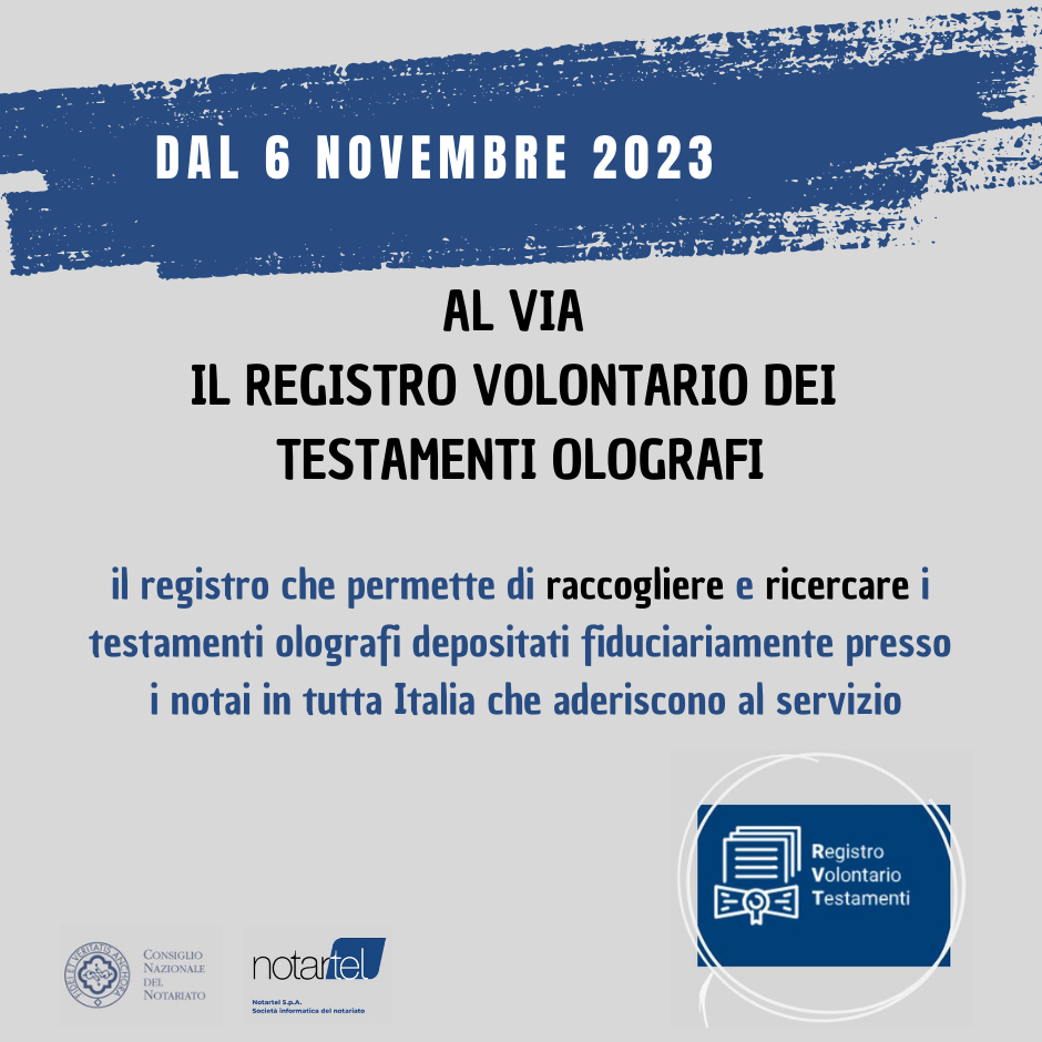 Roma, 6 novembre 2023 – Da oggi diventa operativo il Registro Volontario dei Testamenti Olografi, realizzato dal Consiglio Nazionale del Notariato tramite la Notartel Spa – società informatica del Notariato – che permette di raccogliere e ricercare i dati dei testamenti olografi depositati fiduciariamente presso i notai in tutta Italia che aderiscono al servizio.
