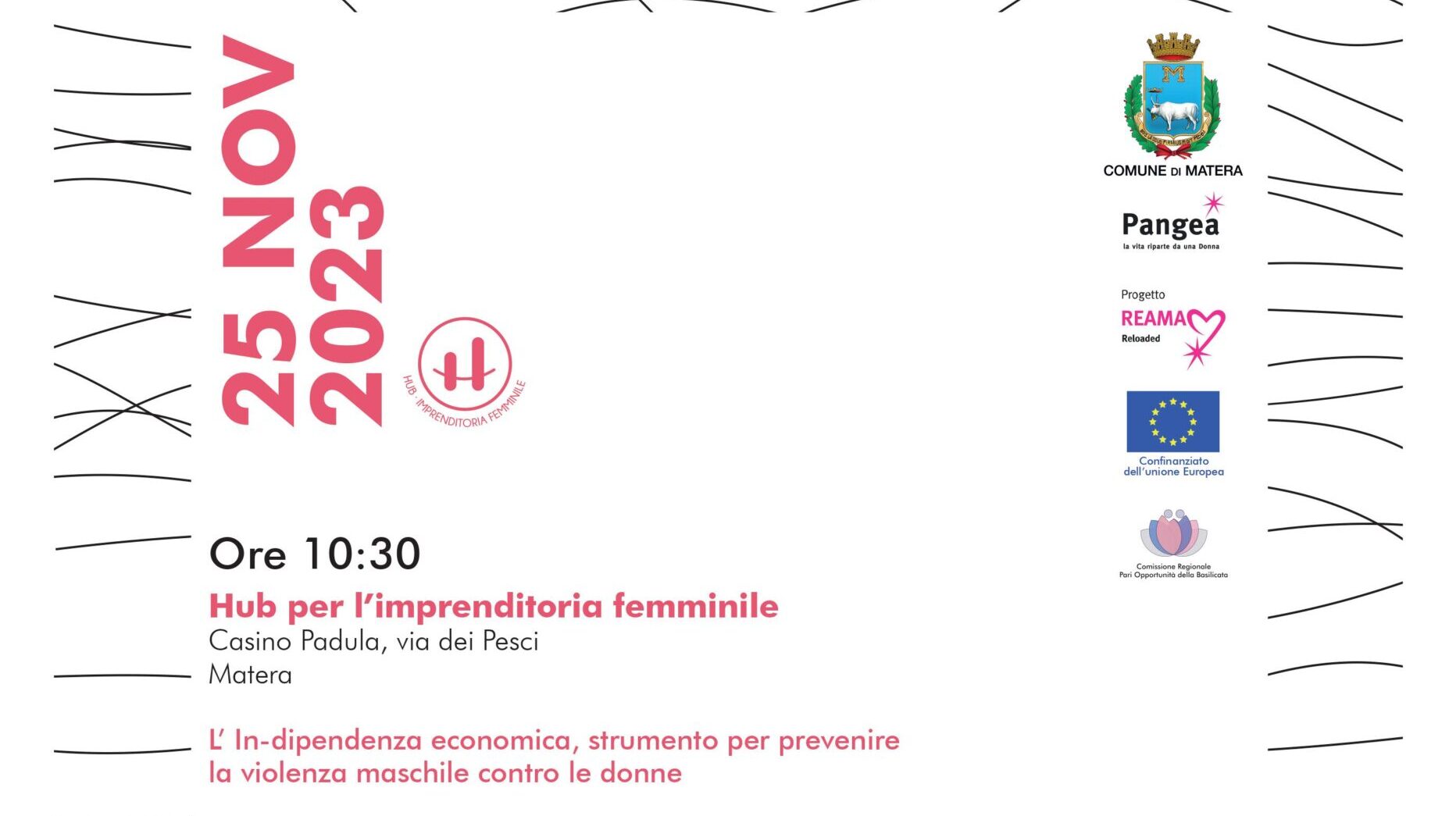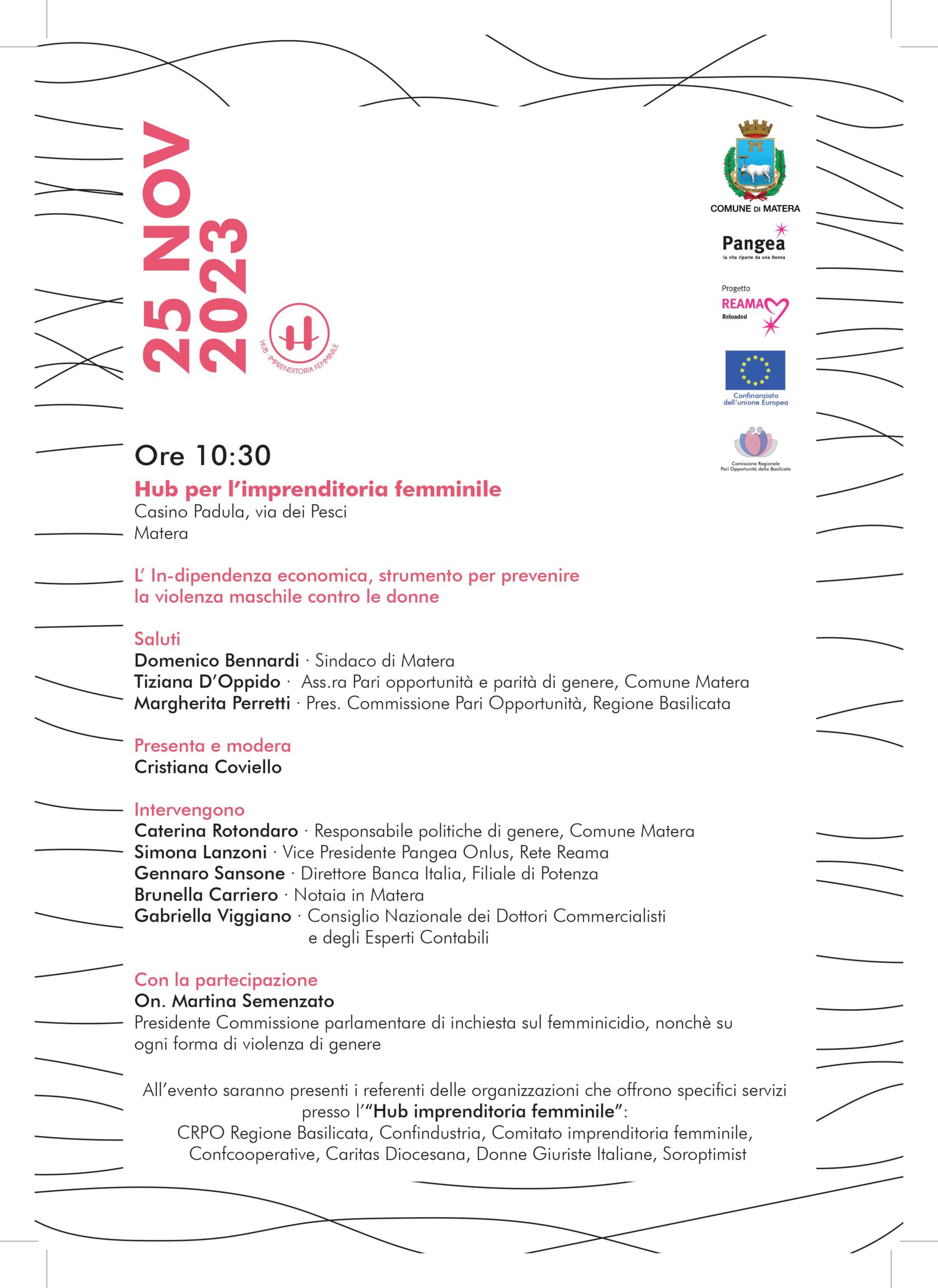 L’evento, moderato da Cristiana Coviello, verrà aperto dai saluti di Domenico Bennardi, Sindaco di Matera, di Tiziana D’Oppido, Assessora alle Pari opportunità e parità di genere del Comune di Matera, di Margherita Perretti, Presidente della Commissione Pari Opportunità della Regione Basilicata. Sono previsti gli interventi di Caterina Rotondaro, Responsabile politiche di genere del Comune di Matera, di Simona Lanzoni, Vice Presidente Pangea Onlus, Rete Reama, di Gennaro Sansone, Direttore della Banca Italia, Filiale di Potenza, di Gabriella Viggiano, membro del Consiglio Nazionale dei Dottori Commercialisti e degli Esperti Contabili.