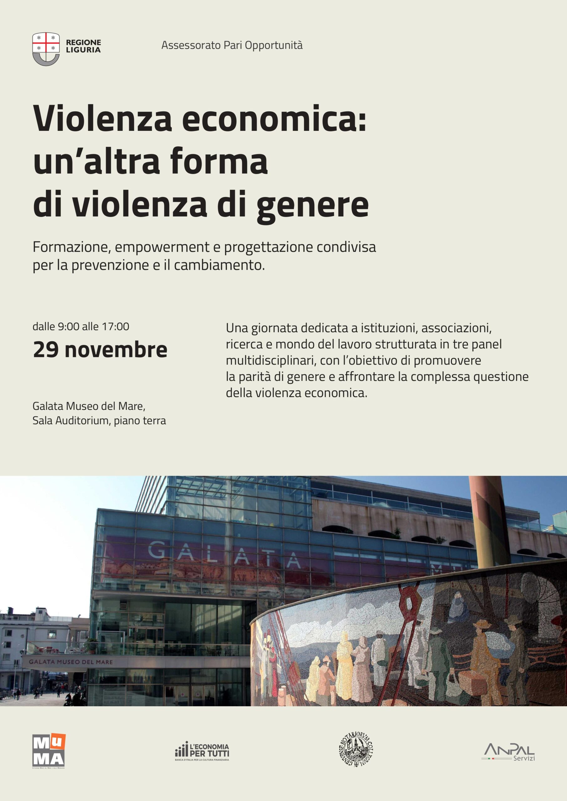 Mercoledì dalle 9 alle 17, nella Sala Auditorium del Galata Museo del Mare, ci sarà il primo convegno aperto al pubblico di Regione Liguria dedicato al tema della violenza economica. Si chiama “Violenza economica: un’altra forma di violenza di genere” e mette al centro l’importanza di promuovere la formazione, l’empowerment femminile e una progettazione condivisa per la prevenzione e il cambiamento.