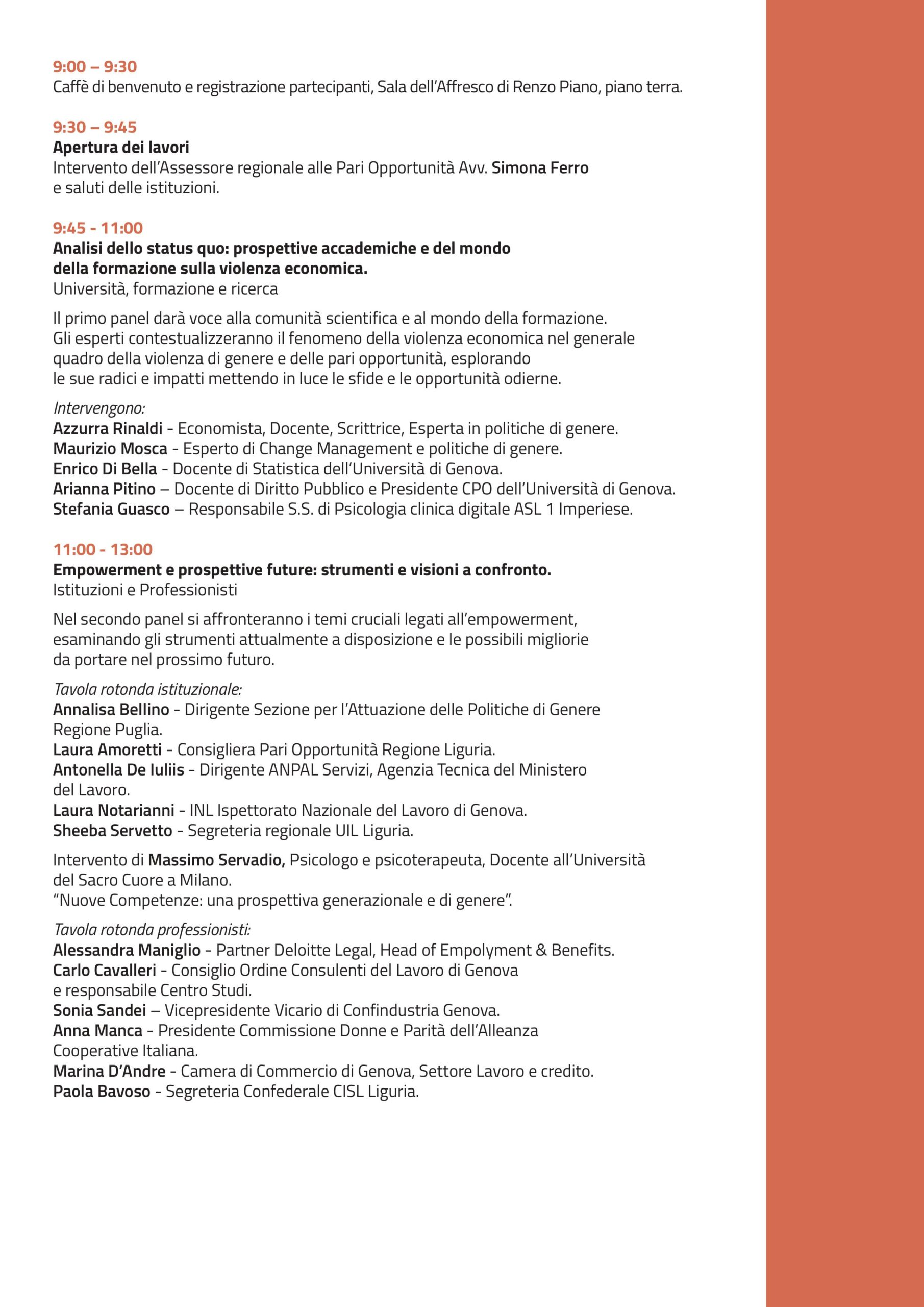 Una giornata dedicata a istituzioni, associazioni, ricerca e mondo del lavoro strutturata in tre panel multidisciplinari, con l’obiettivo di promuovere la parità di genere e affrontare la complessa questione della violenza economica. Il convegno è organizzato in collaborazione con Consiglio Notarile di Genova e Chiavari, Anpal Servizi (agenzia tecnica del Ministero del lavoro) e “L’economia per tutti”, il nuovo portale di educazione finanziaria della Banca d’Italia.